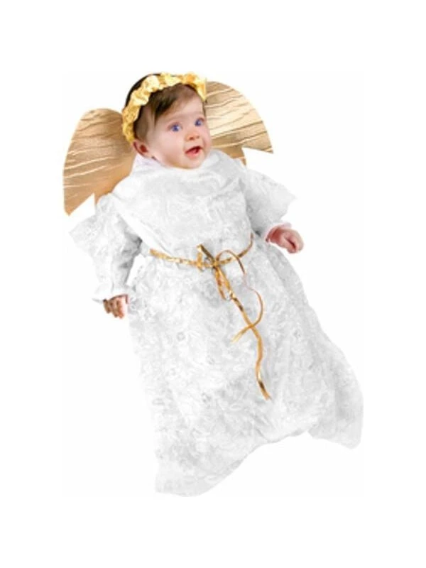 Our baby angel costume is white with gold lace trim, lame wings and halo.