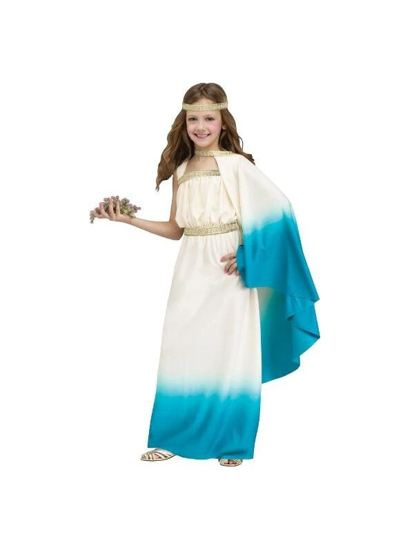 This Greek Goddess costume features a white and blue gown with a gold belt, and a matching gold headband.