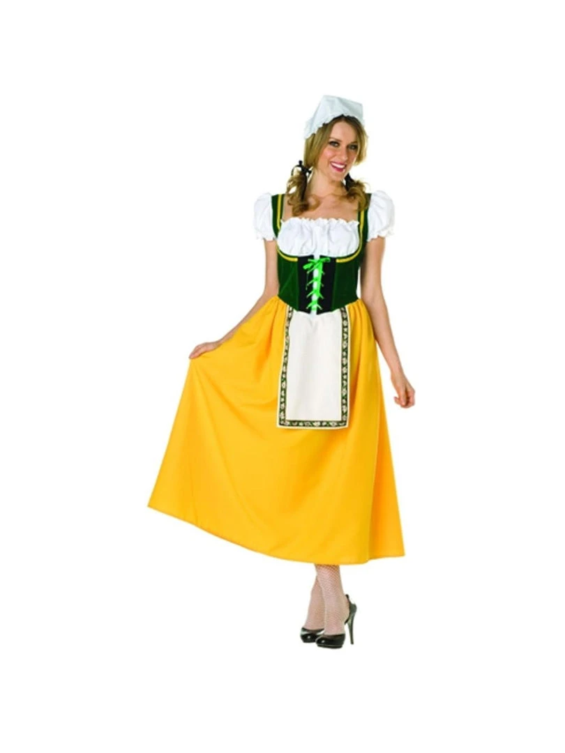 The milk maiden features a yellow and white dress with a green lace up corset, an attached apron, and a white bonnet.