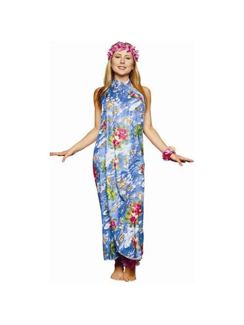 Our adult 3 way Hawaiian sarong costume includes a one piece sarong with 3 ways to wear and lei headpiece.