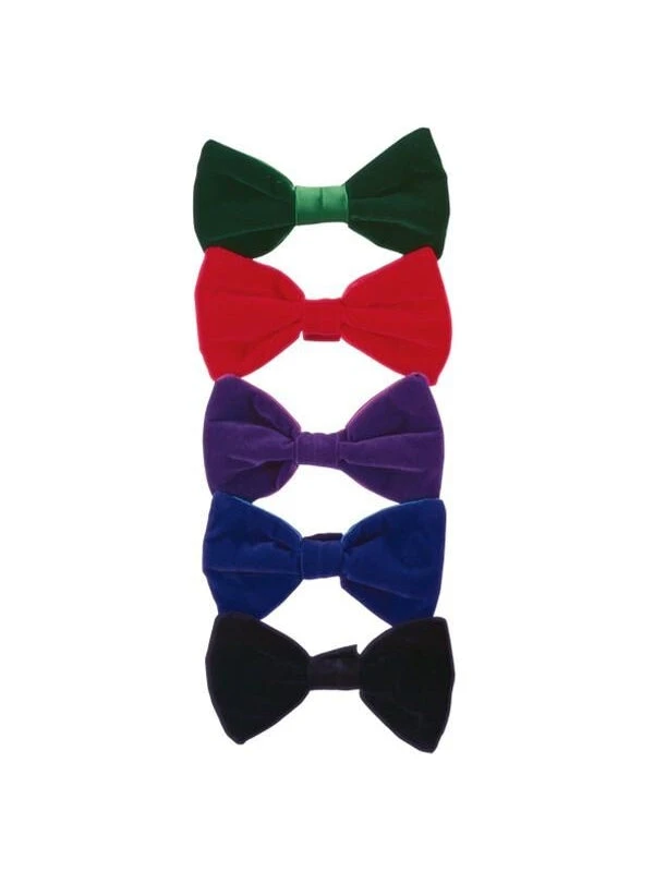 Our velvet bow tie is 5″ wide and complements any funny or formal costume.